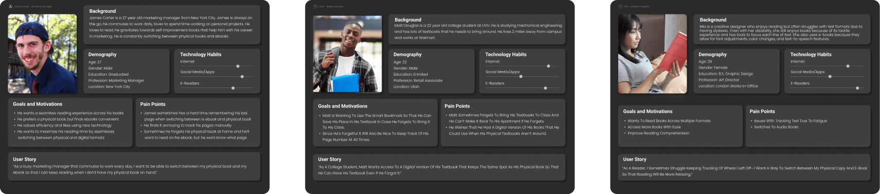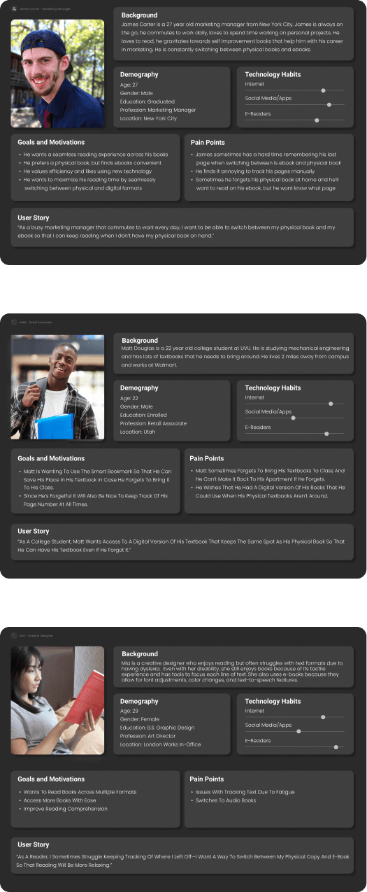 Smart Marks is the solution to that problem with a physical product and an app that tracks your location in a book across physical, e-book and audiobook formats. With this design, users would be able to keep their place in a book no matter where they are and what the circumstances may be.