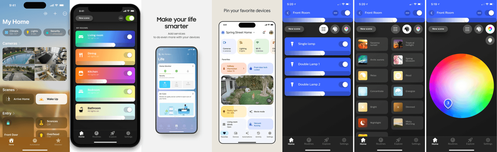 The apps I looked at the most were the Google Home, Samsung SmartThings, Apple Home, and Philips Hue apps. By looking at these apps, I was able to come up with an idea of what my app would look like and what it’s layout would be.